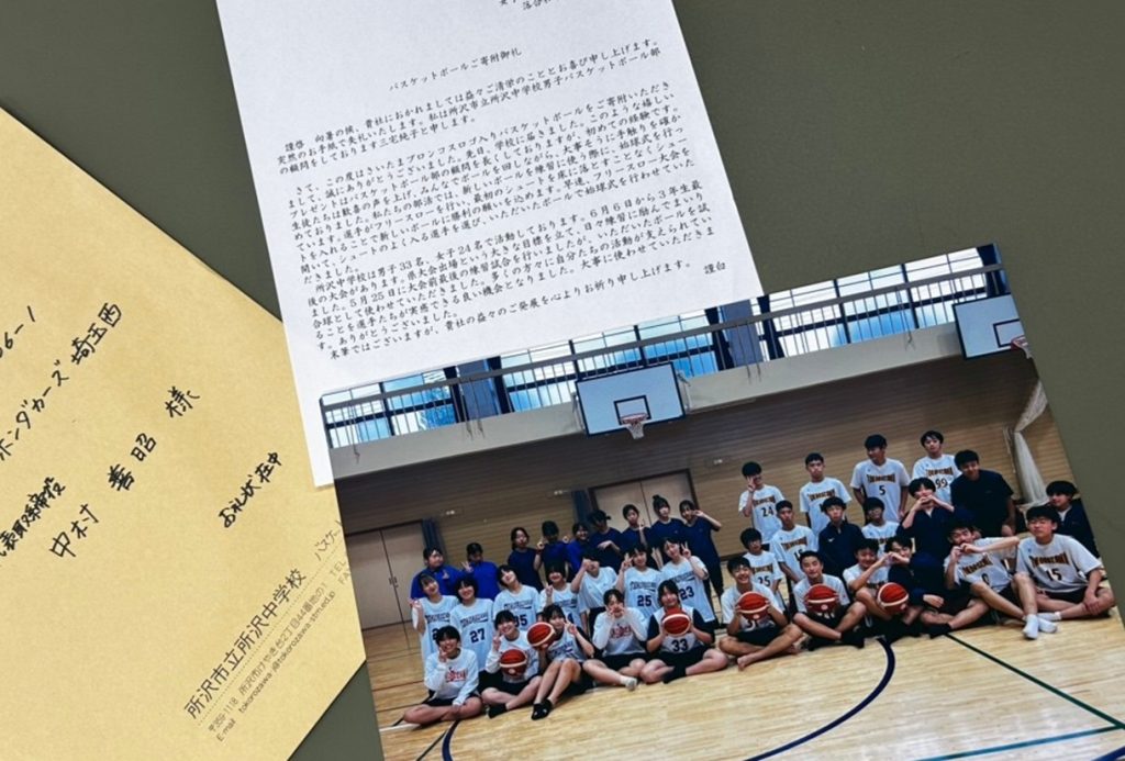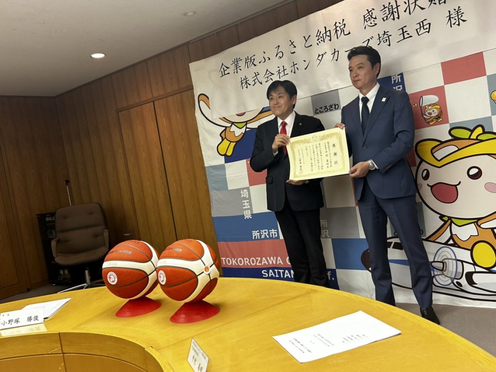 スポーツ振興ならびに環境への配慮を目的に、電気自動車とバスケットボールを所沢市に寄付させていただきました。